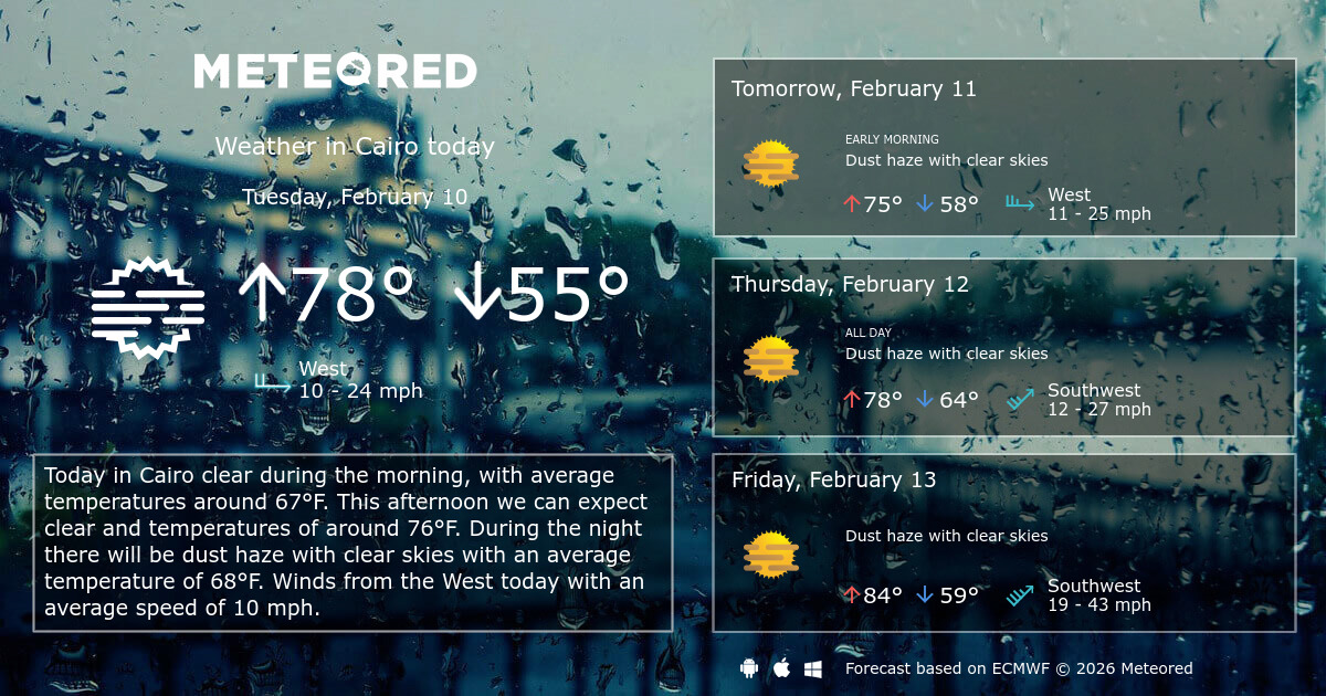 يسجل الطقس في القاهرة خلال هذه الأيام ارتفاعاً ملحوظاً في درجات الحرارة، حيث تتراوح بين 30 و35 درجة مئوية. حيث يتوقع خبراء الأرصاد الجوية أن يستمر هذا النمو في درجات الحرارة في الأسبوع المقبل، مع فرص محدودة لهطول الأمطار، مما يؤثر على نية الكثيرين للاستمتاع بالأيام المشمسة.